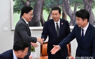 Democratic Party floor leader Kim Byung-ki and People Power Party floor leader Song Eon-..