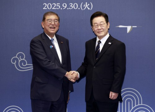 South Korean President Lee Jae-myung (left) and Japanese Prime Minister Shigeru Ishiba shake hands ahead of their summit at the APEC House in Busan on September 30. / Source: Yonhap News |
