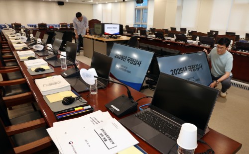 Staff members make final preparations at the parliamentary audit room of the Ministry of Science and ICT at the Sejong Government Complex on October 12, ahead of the first National Assembly audit under the Lee Jae-myung administration. / Source: Yonhap News |