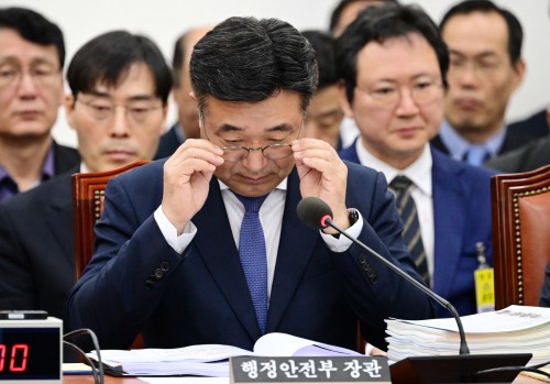 Interior Minister Yoon Ho-jung adjusts his glasses during a parliamentary audit session at the National Assembly in Seoul on October 14. / Source: Lee Byunghwa, Asia Today |