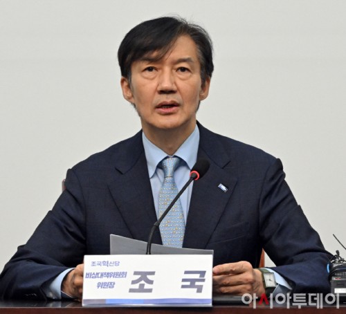 | Cho Kuk, interim leader of the Rebuilding Korea Party, speaks to reporters in Seoul on October 30 after commenting on the U.S.–Korea trade agreement. / Source: Song Ui-joo, Yonhap News |
