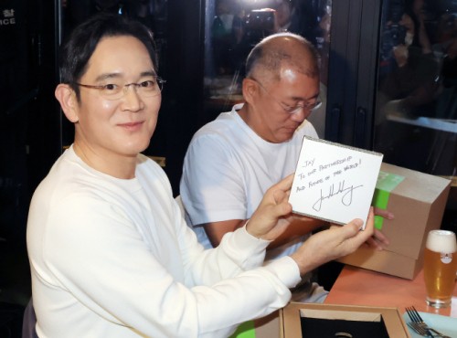 | Samsung Electronics Chairman Lee Jae-yong shows a gift he received from Nvidia CEO Jensen Huang during their dinner meeting with Hyundai Motor Group Chairman Chung Eui-sun at a chicken restaurant in Seoul’s Gangnam District on October 30. / Source: Asia Today, Park Sang-seon |