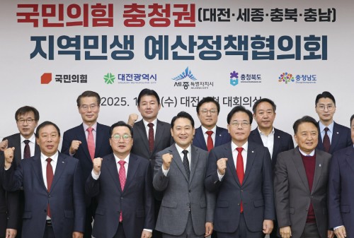 | Leaders of the People Power Party (PPP) and governors from the Chungcheong region pose for a group photo during a policy meeting on regional budgets and livelihoods at Daejeon City Hall on November 5. / Source: Yonhap News |