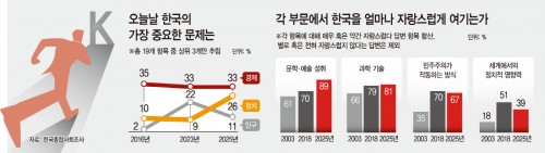 By contrast, pride in Korea’s political influence on the world stage (39%) fell sharply this year, reflecting the country’s uneasy position between Washington and Beijing in an intensifying trade and tariff confrontation. Observers noted that the aggressive tariff policies of the second Trump administration and China’s retaliatory measures have forced Korea into a “balancing act” between superpowers.