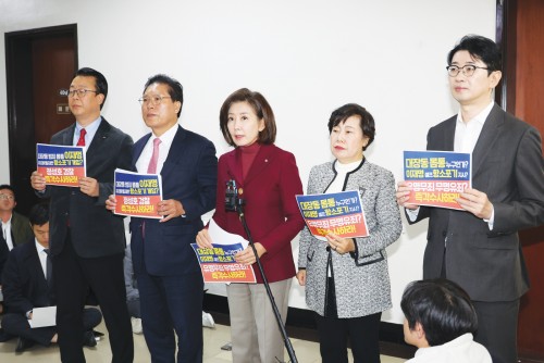 | People Power Party lawmakers, including Rep. Na Kyung-won (center), hold a press conference at the National Assembly in Yeouido, Seoul, on November 10, calling for an emergency inquiry into the prosecution’s decision to drop its appeal in the Daejang-dong development corruption case. / Source: Yonhap News |