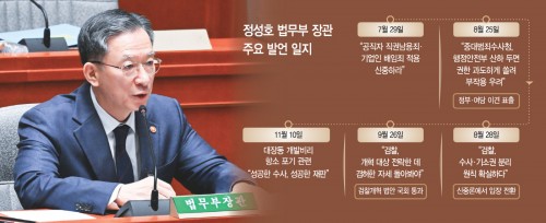 Critics say Justice Minister Chung Sung-ho has acted more like a spokesperson for the presidential office in Yongsan and the ruling party than as the guardian of independent legal administration. As major issues such as prosecution reform unfolded, observers noted that he often aligned with the preferences of the presidential office and ruling bloc, diminishing his own policymaking authority.