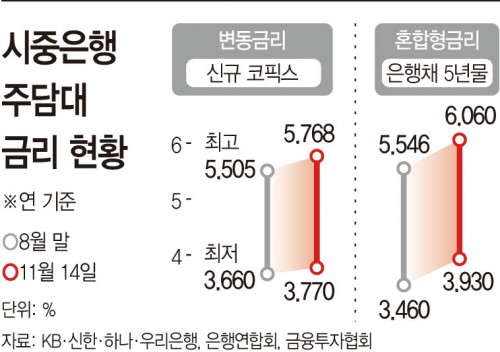 According to financial industry data on November 16, fixed-rate mortgage products at the four major banks—KB Kookmin, Shinhan, Hana, and Woori—stood at 3.930% to 6.060% as of November 14. It marks the first time since December 2023 that mixed (fixed) mortgage rates exceeded 6%. Compared with late August, the lower bound rose by 0.47 percentage points and the upper bound by 0.514 points.