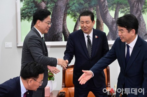 | Kim Byung-ki, floor leader of the Democratic Party (left), and Song Eon-seok, floor leader of the People Power Party, greet each other before an additional round of negotiations on contentious budget items and proposed corporate- and education-tax hikes at the National Assembly on December 1. / Source: Yonhap News |