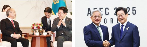 President Lee Jae-myung meets with SoftBank Group Chairman Masayoshi Son at the presidential office in Yongsan, Seoul, on December 5 to discuss cooperation on artificial intelligence. President Lee shakes hands with Nvidia CEO Jensen Huang before their meeting at the HICO convention center during the APEC summit in Gyeongju on October 31. / Source: Yonhap News |