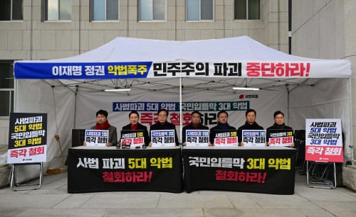 The conservative People Power Party (PPP) has begun an open-ended sit-in under protest tents, vowing to continue its action until the ruling Democratic Party withdraws its judicial reform package. With the governing party holding a majority and pushing ahead with the legislation, the PPP is throwing its weight behind a public-opinion campaign to claw back the political initiative it has lost inside the National Assembly.