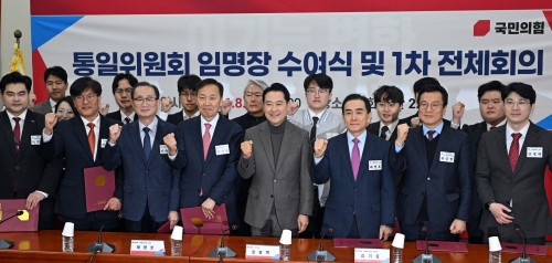 | People Power Party leader Jang Dong-hyuk poses for a photo with committee members at a Unification Committee appointment ceremony and plenary meeting at the National Assembly on Jan. 8. / Song Eui-ju |
