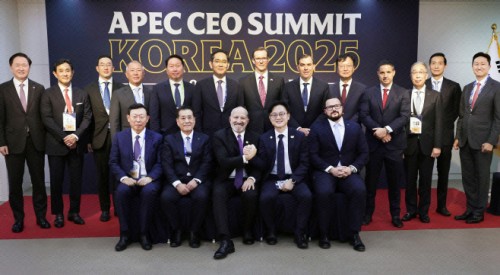 | South Korean Minister of Trade, Industry and Energy Kim Jung-kwan (front row, second from right) poses for a commemorative photo at a summit business roundtable held at the Gyeongju Arts Center in North Gyeongsang Province on Oct. 29, 2025, together with U.S. Commerce Secretary Howard Lutnick (center), Samsung Electronics Chairman Lee Jae-yong (back row, sixth from left), Hyundai Motor Group Chairman Chung Eui-sun (fourth), SK Group Chairman Chey Tae-won (fifth), and LG Group Chairman Koo Kwang-mo (third). / Courtesy of the Ministry of Trade, Industry and Energy |