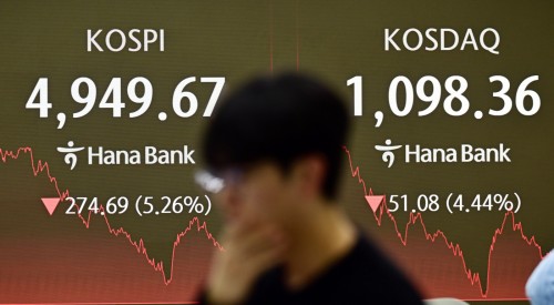 According to the Korea Exchange, the KOSPI closed at 4,949.67, down 274.69 points, or 5.26%, from the previous session. Foreign investors and institutions dumped shares worth 2.52 trillion won and 2.21 trillion won, respectively.