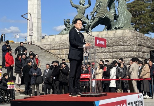 | People Power Party leader Jang Dong-hyuk delivers a speech during a rally calling for the protection of judicial independence and the constitution in front of the National Assembly in Seoul on March 3. / Chae Jong-il |