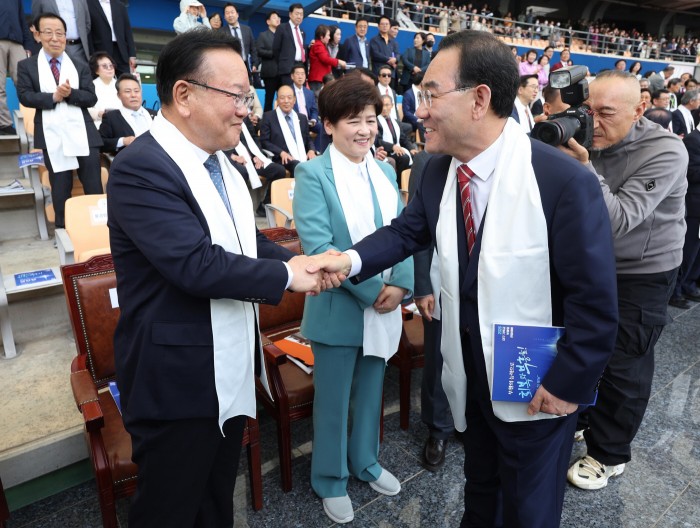 | Joo Ho-young (right), vice speaker of the National Assembly, shakes hands with Kim Boo-kyum during a joint Easter service held at Daegu Stadium on April 5. /Yonhap |