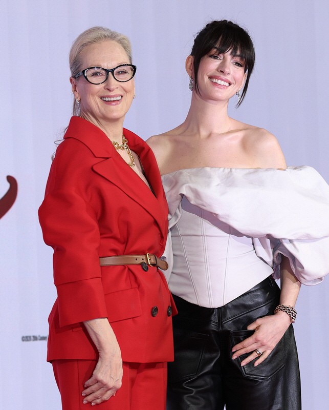 Streep appeared at a press conference held on April 8 at the Four Seasons Hotel Seoul alongside co-star Anne Hathaway.