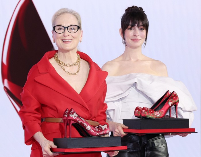 | Meryl Streep (left) and Anne Hathaway receive traditional Korean flower shoes reinterpreted as high heels at a press conference for The Devil Wears Prada 2 held at the Four Seasons Hotel Seoul in Gwanghwamun, Seoul, on April 8. / Yonhap |