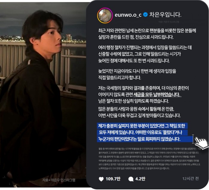 Cha Eun-woo issued a public apology regarding a recent tax controversy, stating that all related taxes have been fully paid and that he will take full responsibility.