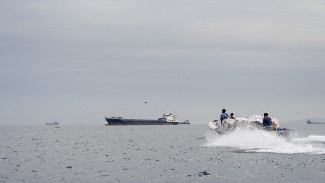 | Ships and boats sail through the Strait of Hormuz off the coast of Musandam, Oman, on April 12. / Reuters-Yonhap News |