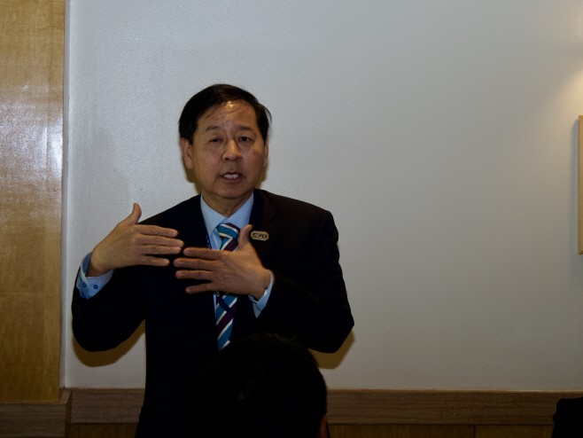 | Koo Yun-cheol, Deputy Prime Minister and Minister of Economy and Finance, speaks during a meeting with Korean correspondents at a restaurant in Arlington, Virginia, near Washington, D.C., on April 16. / Washington correspondent Ha Man-joo |
