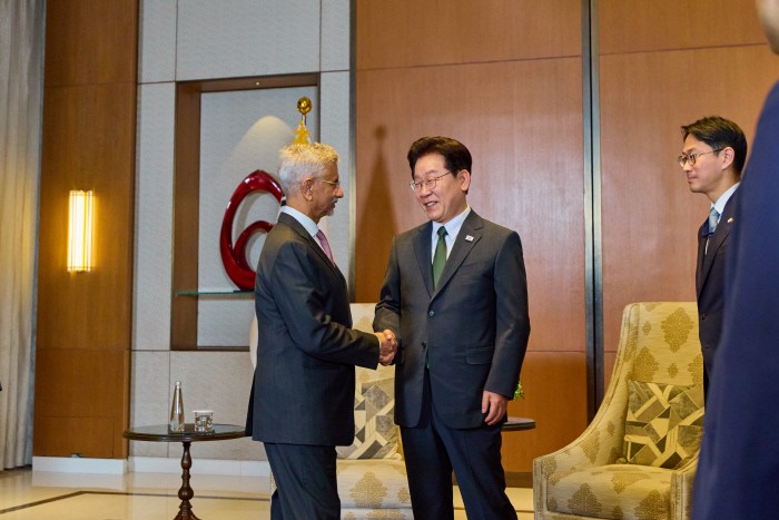 | Lee Jae-myung, on a state visit to India, meets with Subrahmanyam Jaishankar at a hotel in New Delhi on April 19. /Yonhap |