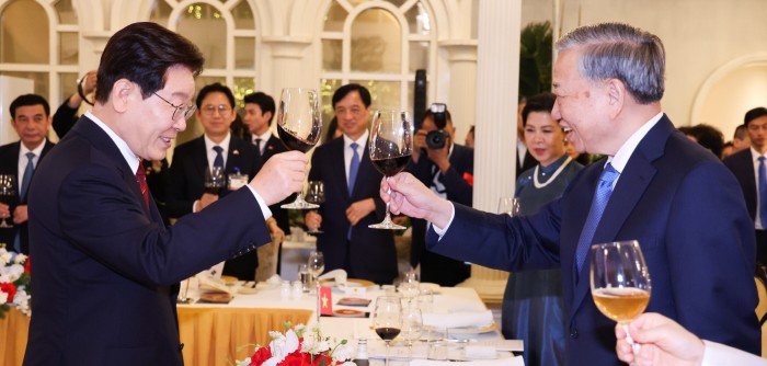 | President Lee Jae-myung and To Lam, general secretary of the Communist Party of Vietnam and president, toast during a state banquet welcoming the Korean president at the Presidential Palace in Hanoi on April 22. / Yonhap News |