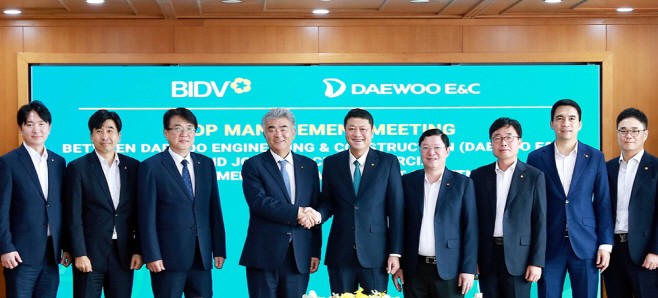 | Jung Won-ju, Chairman of Daewoo E&C (center left), and Le Ngoc Lam, President of Bank for Investment and Development of Vietnam (BIDV) (center right), pose for a photo after a meeting at BIDV headquarters. / Daewoo E&C |