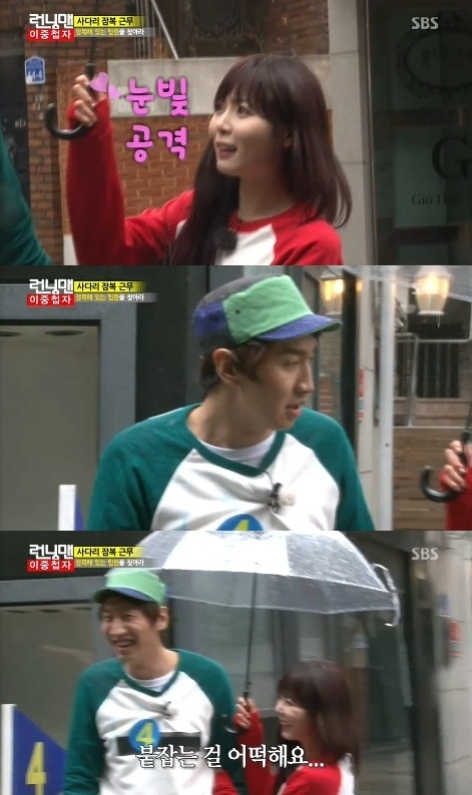 HyunA and Lee Kwang Soo from the opposing teams waited in one spot together for their teammates under the mission to gather together and move to a certain place in a team. Lee Kwang Soo's team came earlier, so HyunA grabbed onto his arms and begged, "Oppa, don't go."