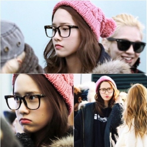 In the picture, Yoona is wearing a pink knit hat and big horn-rimmed glasses, showing off her beauty.
