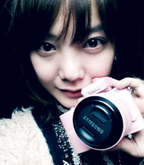 In the picture, Go is staring at the camera, holding a pink camera. Her eyes and translucent skin are particularly eye-catching.