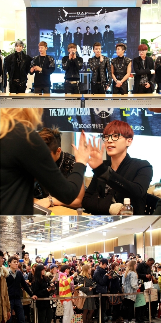 All six members of group B.A.P gathered together to hold a fan signing event.