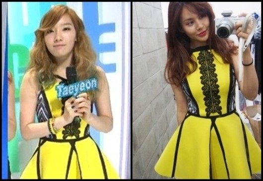 In the photos, Girls' Generation (SNSD) member Taeyeon and singer Ivy are both wearing the same yellow dress but they are giving off completely different atmosphere. Taeyeon looks cute and adorable while Ivy looks more chic and seductive.