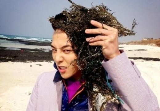 In the picture, G-Dragon is seen is Jeju island for the SBS' show "Thank You" and is holding up seaweed next to his head. It reminded fans of his seaweed hairstyle back when he was promoting "Fantastic Baby".