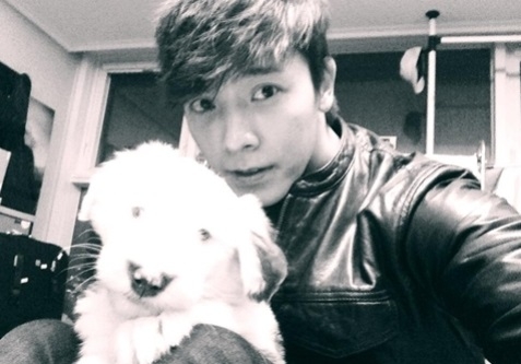 In the picture, Donghae is showing off his manly charms in his stylish jacket and blue jeans while holding a puppy.