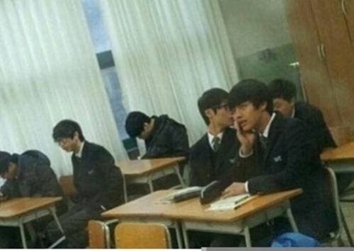 In the picture, the actor is wearing a school uniform, sitting down on his desk with his hand under his chin as if he is lost in thought. He is showing off his good looks among his friends.