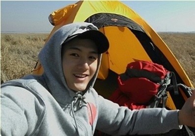 In the picture, the actor is taking a selca after setting up a tent for camping in the wilderness. Lee is wearing casual training wear with a cap and smiling at the camera.