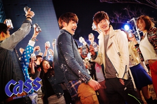 The picture is taken when the two actors were shooting a beer commercial together. Lee is wearing a jacket with the collar turned up while Kim is wearing a casual blue jean jacket.