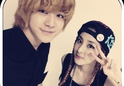 In the picture, Sandara is wearing a cap backwards and is making a V sign with her fingers showing off her cute charm, while her younger brother Thunder of boy group MBLAQ is making a cute smile.
