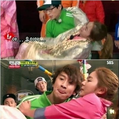 Yoo Jae Suk held up Uee in his arms, but dropped her right away. He looked bewildered and said, "Uee is weird. It's not the Uee that I thought she was."