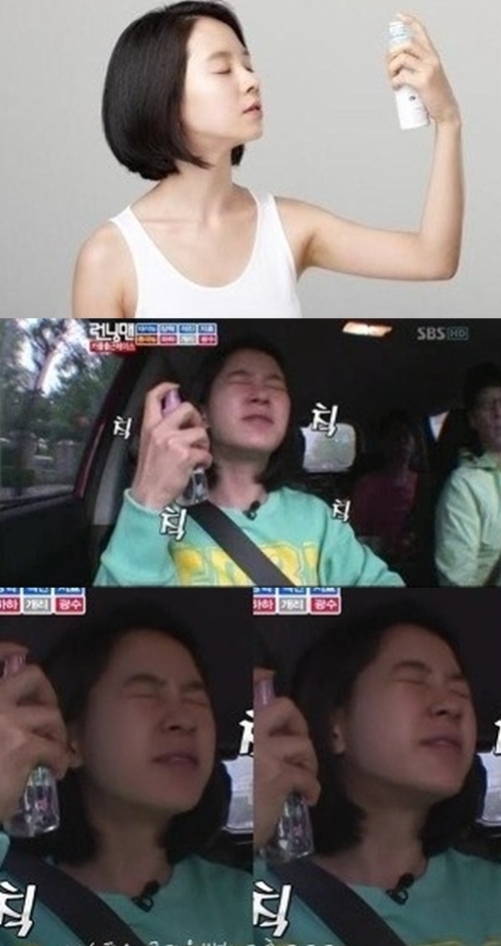 However, the second picture shows Song on SBS' variety show "Running Man", where she is spraying mist on her face with a frown, showing off her easygoing charm.