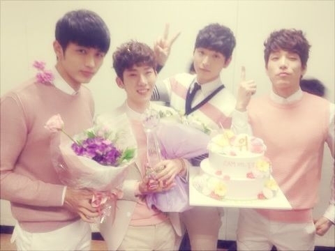 In the picture, 2AM members are holding a flower bouquets and a cake with big smiles.