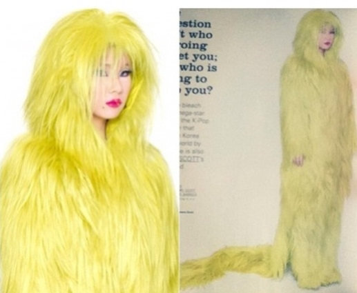 In the picture, CL is sporting yellow fur costume. CL pulled off a provocative look with heavy smoky eye make-up and red lipstick. Her clothes was a bit unconventional, however, she managed to make it look fashionable and edgy.