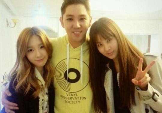 In the picture, Kangin is posing for the camera together with Girls' Generation members Taeyeon and Seohyun, looking affectionate. Kangin's 'Bad manner hand' was caught by having his arm around Taeyeon tightly.