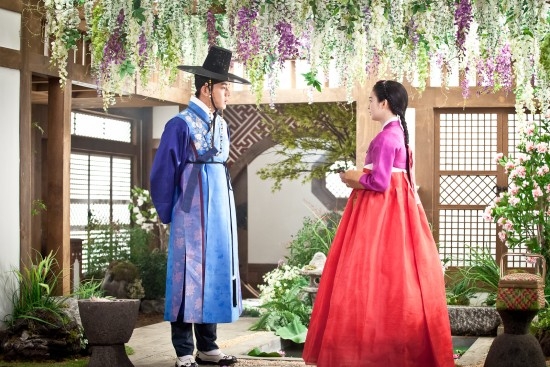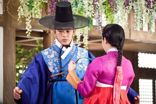 The photos revealed on March 26 show Jang Ok Jung (played by Kim Tae-Hee) confidently measuring the clothing size of Prince Yi Soon (or King Sukjong, played by Yoo Ah-In), who looked a bit embarrassed on the contrary.