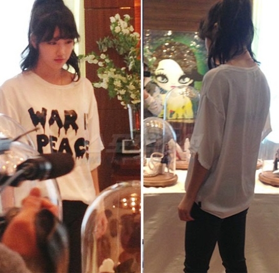 In the photos, Suzy showed off her great body proportions with her 168cm height and thin body line. Suzy is seen wearing a printed t-shirt matched with leather skinny jeans.