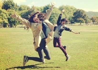 In the picture, f(x)'s Krystal and Amber are jumping on the green grass while in New Zealand.