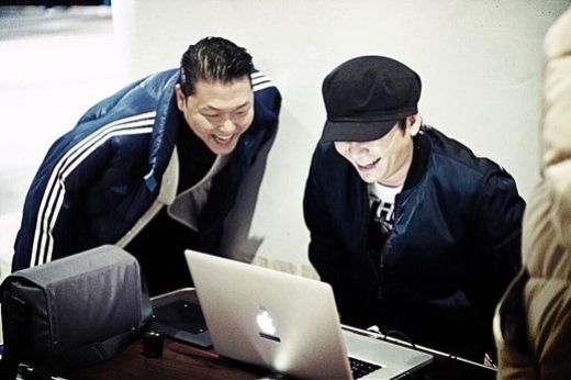 In the picture, Psy and Yang Hyun-Suk are laughing out loud while looking at a laptop screen, presumably playing Psy's new music video 'Gentleman'.