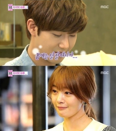 Kwanghee prepared a goodbye letter and read it to Sunhwa. He said, "Although we didn't get married for real, I don't know what to say thinking that we're ending our virtual marriage. But thank goodness. It's warm spring. Your hands and feet are cold but they would be warm if it's spring."