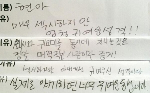 The picture shows the results of a survey conducted by Weekly Idol on HyunA's real personality. Many idols including Raibow's Woori, VIXX's Ravi, Boyfriend's Jungmin, and Dal Shabet's Serri participated in the survey. Most of them agreed that HyunA is sexy but cute, as well.