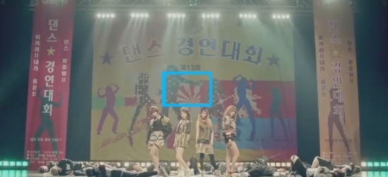 The music video shows a dance contest poster, which features red rays that look much like the Japanese Rising Sun Flag. Particularly, the T-ara N4 members dance in front of a big banner that suggests the Rising Sun Flag.
